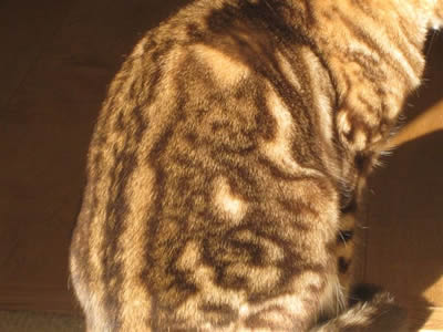 Beautiful pattern shot captured here by her new mom Jackie and dad Craig. You will see from the picture how the different colour tones in her marble pattern and her background colour create an amazing contrast. Shinga also has lots of glitter which gives her coat a very shiny look. |